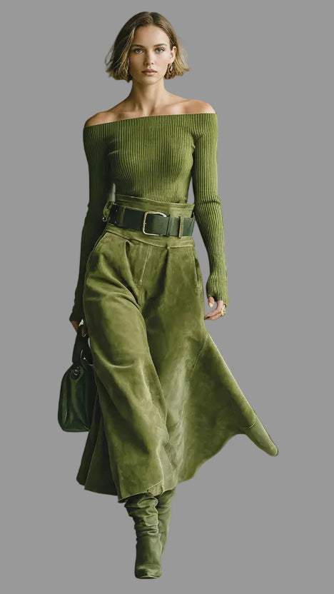 Tipo: Conjunto de dos piezas (top + falda) · Ajuste: Entallado en la parte superior con falda de caída fluida · Corte: Cintura alta con silueta femenina y equilibrada · Detalles: Escote off-shoulder, tejido efecto ante y cinturón incluido · Largo: Midi · Material: Punto acanalado suave y falda en tejido efecto ante · Estilo: Elegante, moderno y versátil · Uso recomendado: Oficina, eventos, cenas y ocasiones especiales · Temporada: Otoño e invierno · Colores disponibles: Varios tonos · Cuidados: Lavado delicado a máximo 30°C · Secado en plano recomendado.