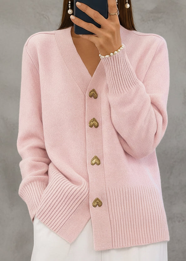 Diseño delicado y femenino que combina calidez y elegancia en una prenda atemporal. Este cardigan de punto presenta una silueta ligeramente entallada que estiliza la figura, junto a un favorecedor escote en pico que realza el cuello y el escote. Sus botones decorativos en forma de corazón aportan un toque especial y romántico, mientras el tejido suave y cálido ofrece una sensación envolvente y confortable durante todo el día. Perfecto para crear looks elegantes con un aire dulce y moderno.