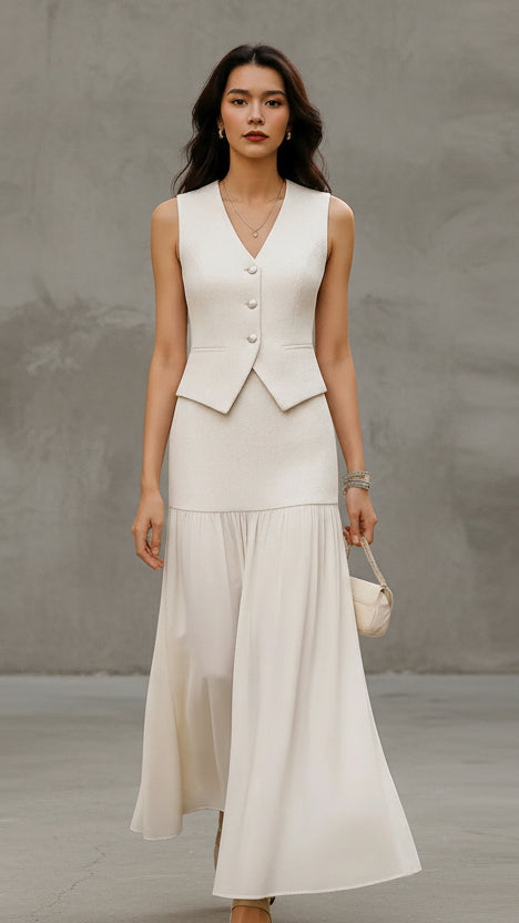 Porque es el conjunto que encarna la elegancia coordinada con sutileza. El chaleco con botones de perla aporta un toque refinado y femenino, mientras que la falda maxi de cintura alta crea una silueta alargada y equilibrada.