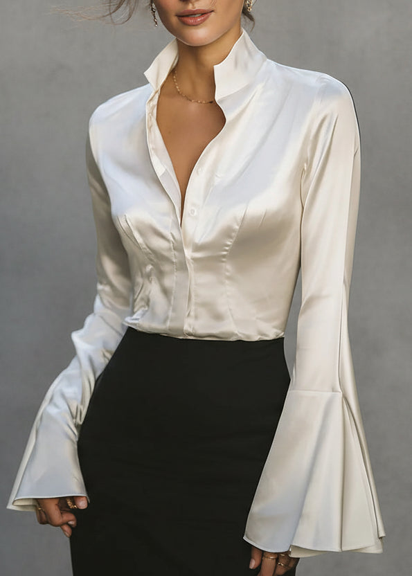 Diseño: Blusa satinada con cuello alto estructurado y mangas campana